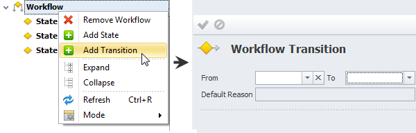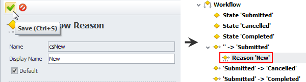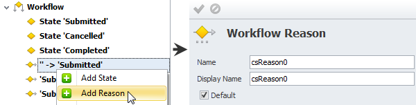 NoteEach transition should have at least one reason, but if you have a simple workflow and you don't want to specify the reason each time you change one entity state to another, you can leave the Default check box selected, so that the reason can be entered automatically when the entity state is changed.