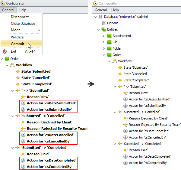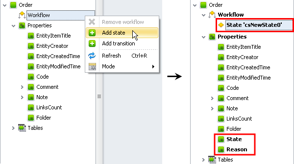 Entity workflow consists of States, Transitions, Reasons, and Actions.