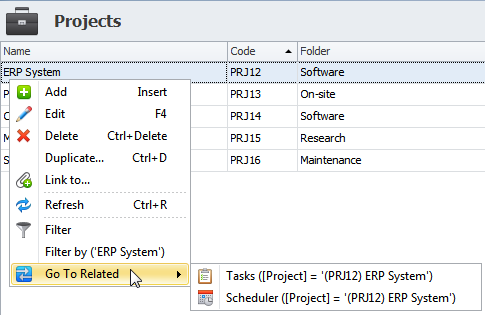 1. Right-click required project in the Projects view, and then point to Go To Related.