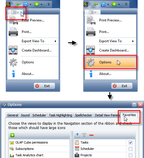 • Click Application Menu, click Options, and then in the Options dialog box, click the Favorites tab.