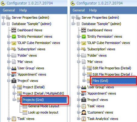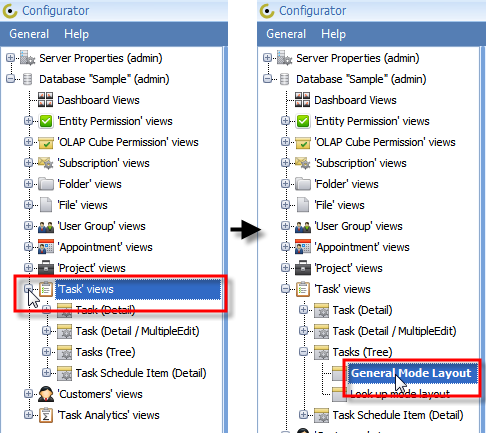 3. Click Plus (+) to expand required entity views, for example, 'Task' views, then click Plus (+) to expand required view, for example Tasks (Tree), and then click General Mode Layout.