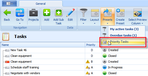 You can start CentriQS and then on the ribbon, in the View group, click Presets to check if the preset you created is among shared presets, for example, in the Tasks view.