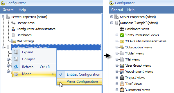 2. Right-click the database, point to Mode, and then click Views Configuration.