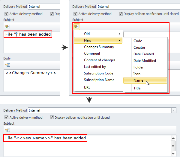 6. To change default subject and body of internal notification, enter required text or position the pointer into the required place, right-click, and then click required variables.