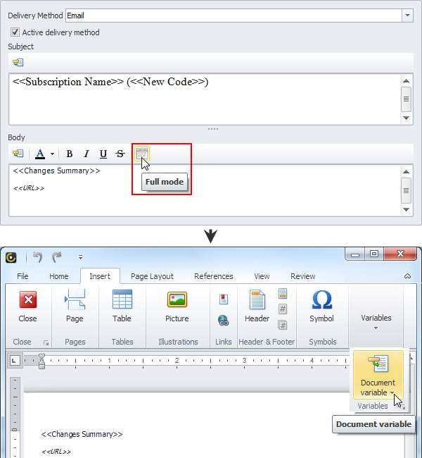 8. To change default subject and body of email notifications, enter required text or position the pointer into the required place, right-click, and then click required variables.
