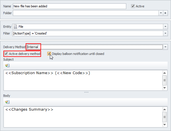 5. To get Internal notifications, leave the Active delivery method check box selected.