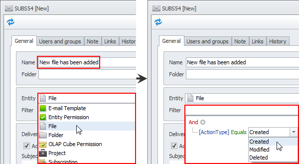 4. Type the name of new subscription, click required entity in the Entity list, and then set appropriate condition in the Filter box. For example, you can add a filter condition for getting notifications when a new file is added to the database.