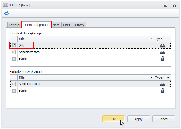9. To subscribe users and groups to notifications, click the Users and Groups tab, and then select check boxes next to required users and groups in the Included User/Groups list and Excluded User/Groups list.