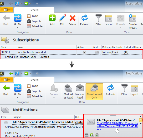 After saving the changes, new subscription will appear in the Subscriptions view and appropriate users will start getting notifications.