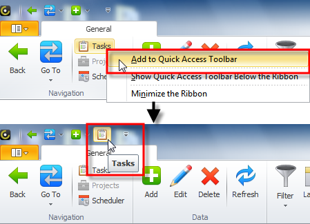 - Right-click required command on the ribbon, and then click Add to Quick Access Toolbar.