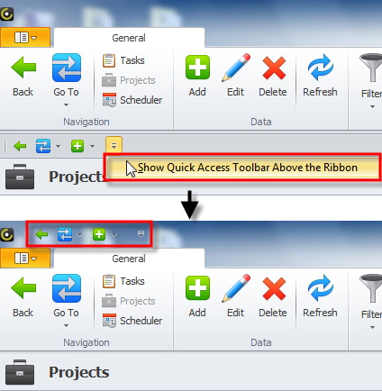 - Click Customize Toolbar, and then click Show Quick Access Toolbar Above the Ribbon.
