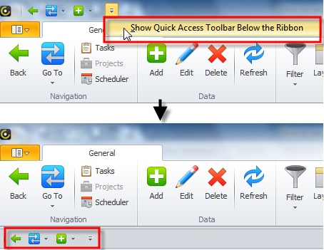 - Click Customize Toolbar, and then click Show Quick Access Toolbar Below the Ribbon.