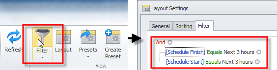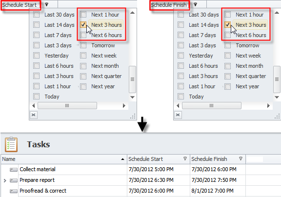 - Point to the Schedule Finish column header, click the Quick Filter icon on its right side, and then select a check box next to required time period (Last 1 hour, Last 3 hours, Last 6 hours, Next 1 hour, Next 3 hours, Next 6 hours).