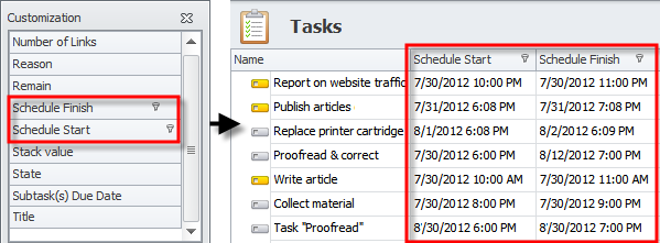 - In the Tasks view, right-click a column header, click Column/Band Chooser, and then drag Schedule Start and Schedule Finish from the Customization dialog box to column headers.
